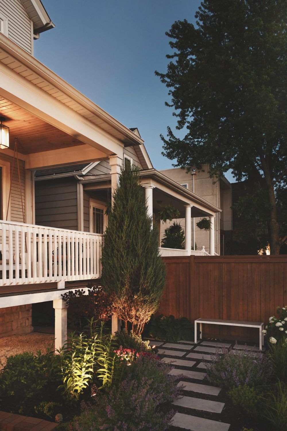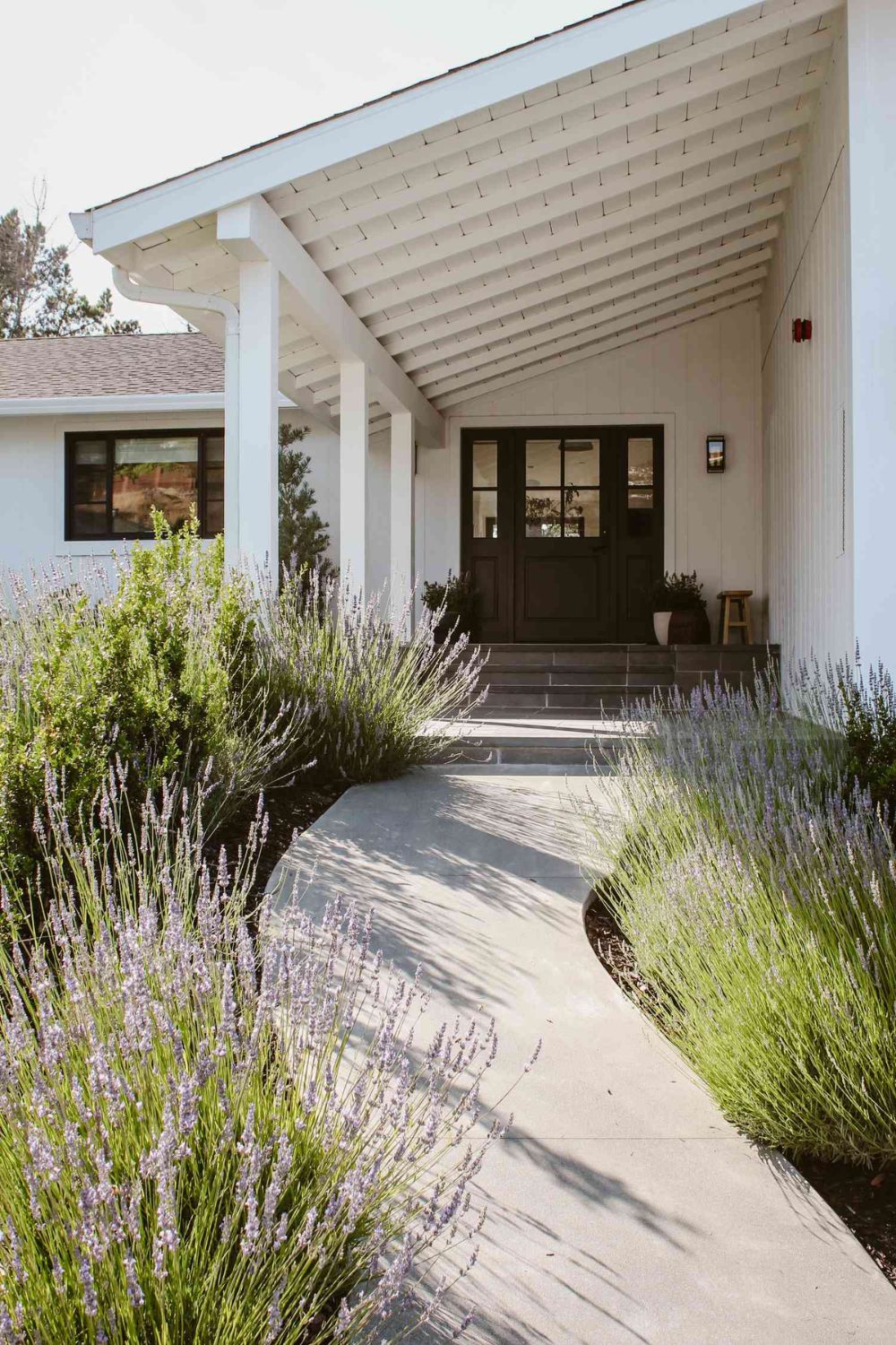 Use boxwoods, lavender, or ornamental grasses to flank your path, drawing the eye naturally toward the front door.